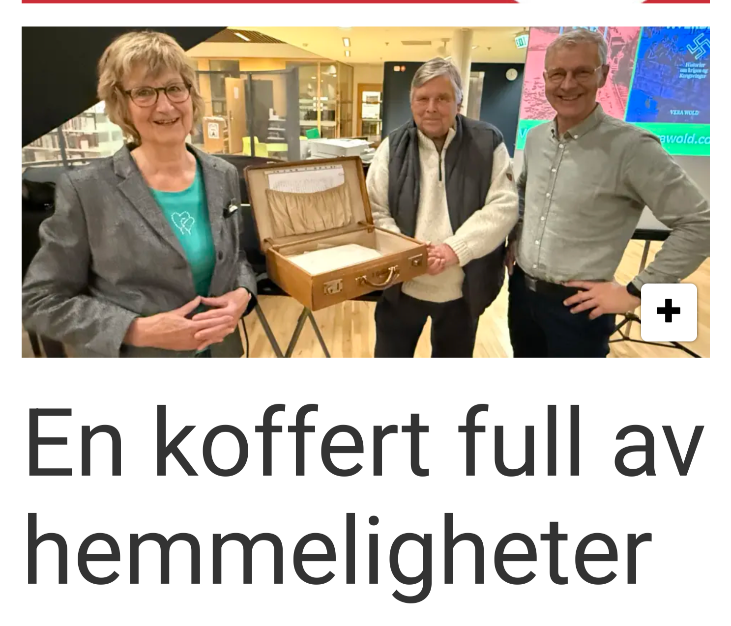 Thora Hauge-Olsens brune koffert var en gullgruve da jeg skulle skrive om henne. Barnebarna Gustav Karlsen (t.v.) og Trond B. Karlsen har tatt vare på den. Og de er veldig stolte over sin tøffe mormor. (Printscreen fra MittKongsvinger)