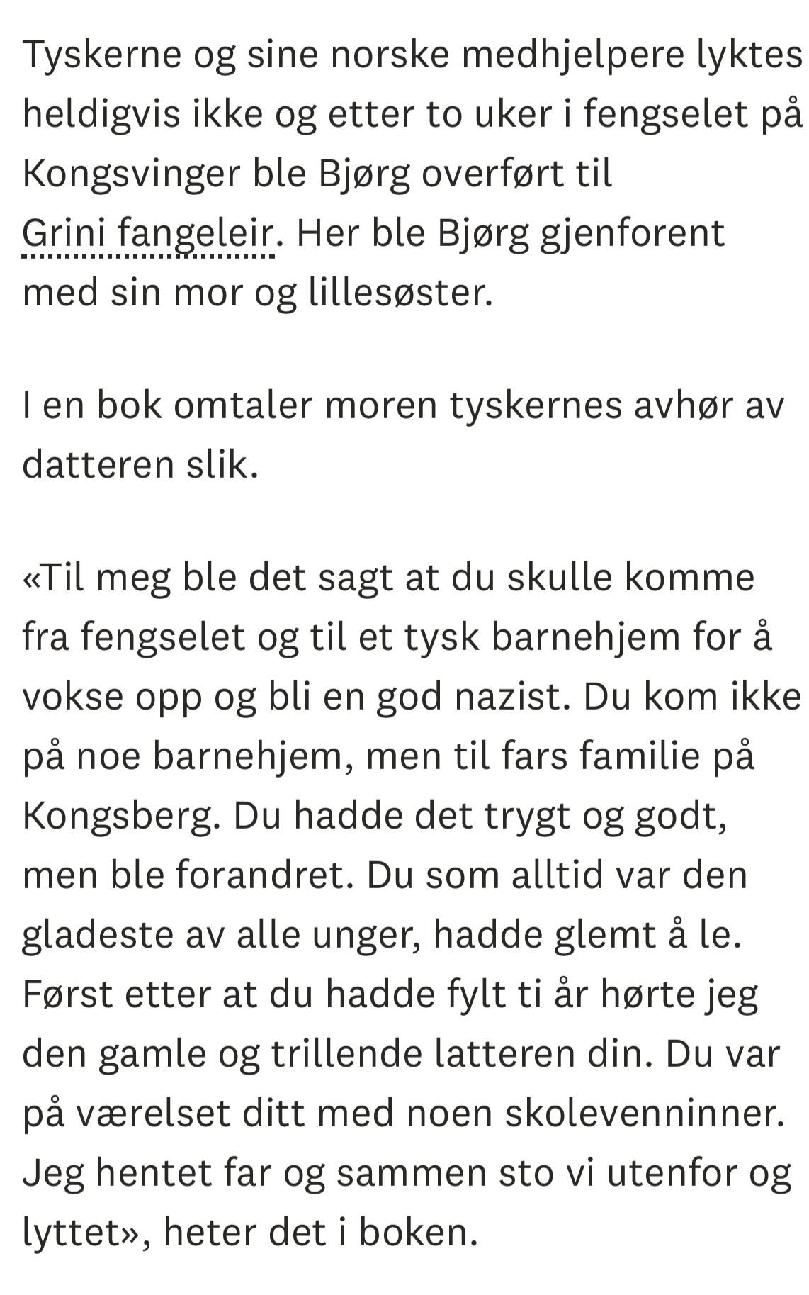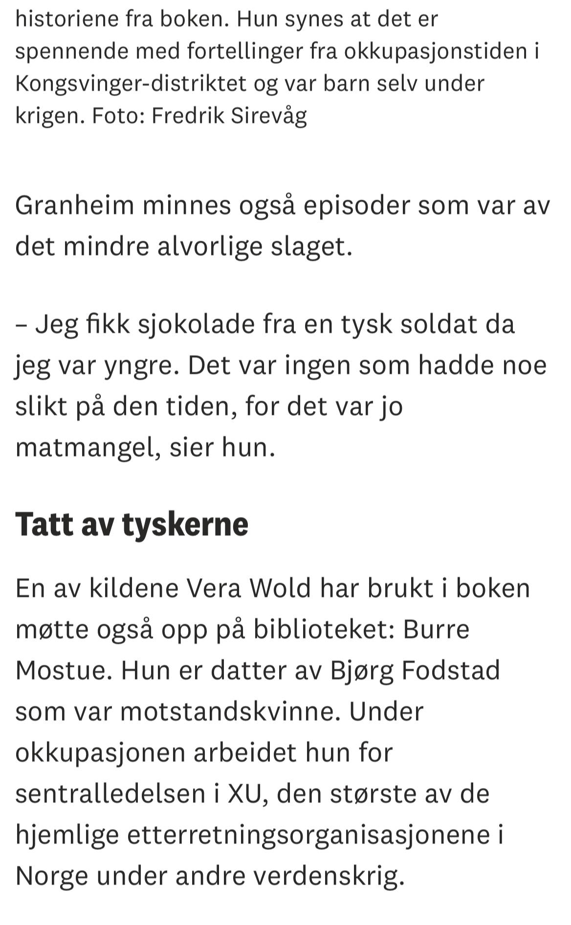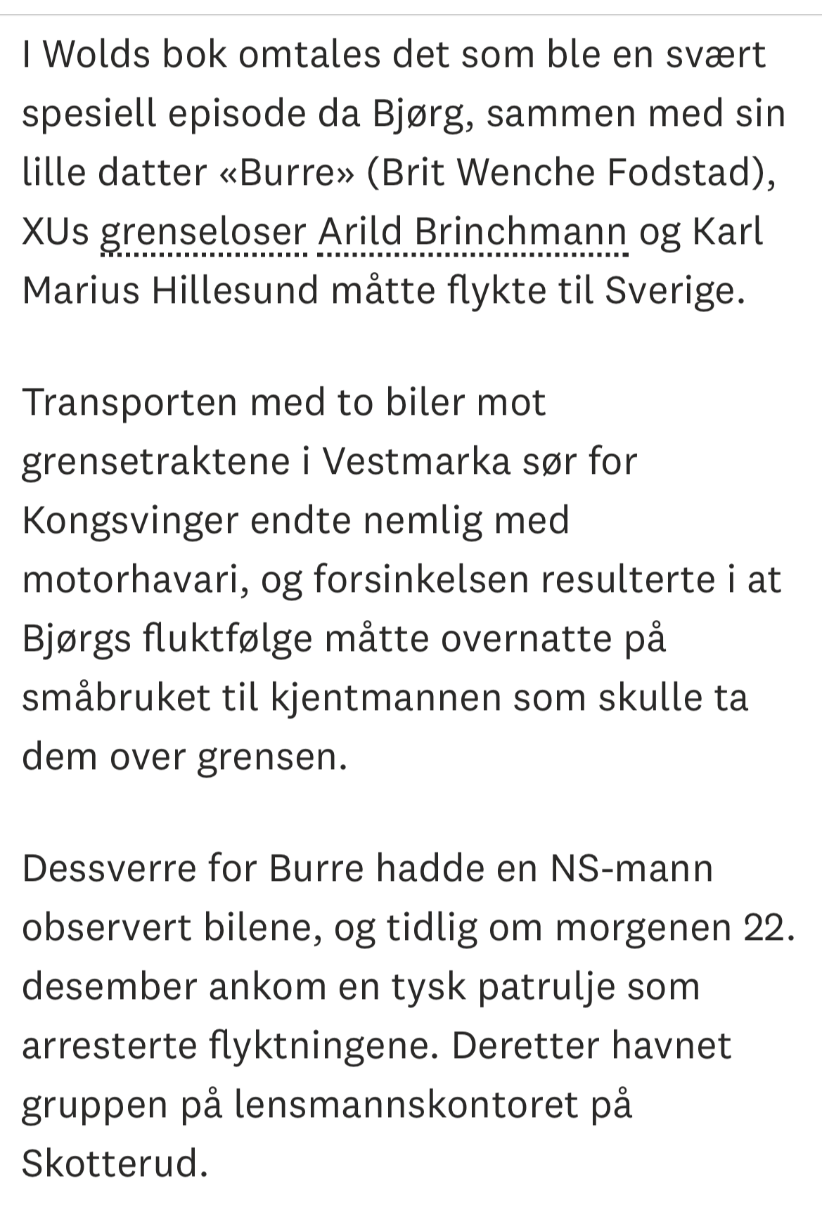 Ekstra gledelig var gjensynet med barnebarna til krigshelten Thora Hauge-Olsen, De hadde med seg mormorens koffert med hemmelige dokumenter og ikke minst Burre, Brit Wenche Moestu, som kunne fortelle fra flukten med moren Bjørg Fodstad mot svenskegrensa i Eidskog i desember 1944. Bjørg var lege for den hemmelige etterretningsorganisasjonen XU og ble arrestert sammen med femåringen Burre av nazilensmannen i Eidskog. For ei dame! Moren fikk høre at Burre skulle på barnehjem og bli en god nazist, men hun ble heldigvis sendt til besteforeldrene sine.