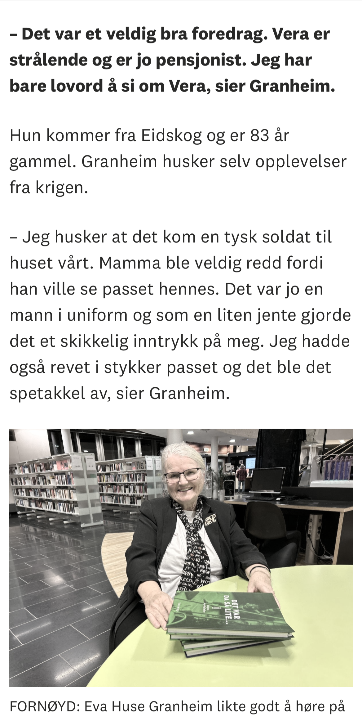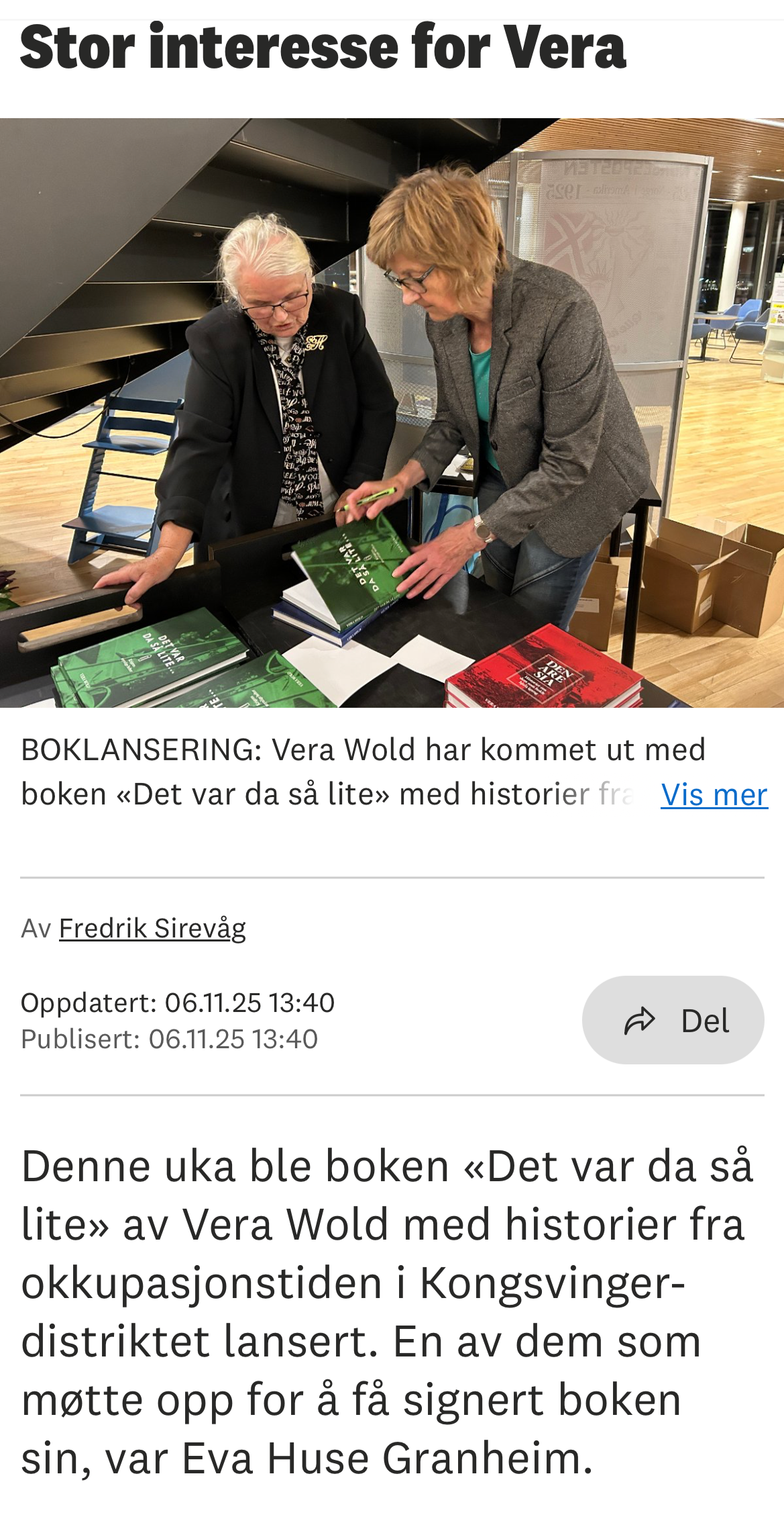 Artig var det også at både Glåmdalen og MittKongsvinger lagde egne vrier på sine fyldige omtaler av arrangementet, samt at mine gamle kolleger i NRK Innlandet hadde et lengre innslag på P1 tidligere på eftan. Og på mandag 24.11.25 var jeg gjest hos NRK P1+. Madeleine Cederstrøm har en lang samtale med meg om boka. Nå nådde den ut over hele landet og kanskje litt lenger. Heltene mine får den oppmerksomheten de har fortjent! Det var ikke så lite…